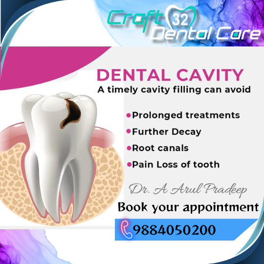 Cavity tooth treatment at Craft32 dental care virugambakkam At Craft32 Dental Care in Saligramam, we understand the importance of addressing dental decay promptly to maintain optimal oral health. Our experienced team utilizes advanced techniques and technologies to effectively treat cavities and prevent further damage to your teeth. During your visit, our skilled dentists will thoroughly assess the extent of your cavities and recommend personalized treatment options tailored to your unique needs. Whether you require dental fillings, dental crowns, or other restorative procedures, we are committed to restoring your smile's health and vitality. But prevention is key! Our team will also provide valuable education and guidance on how to maintain proper oral hygiene practices at home to prevent future cavities. By adopting a consistent routine of brushing, flossing, and regular dental check-ups, you can safeguard your smile against the harmful effects of cavities. Don't let cavities compromise your oral health and confidence any longer. Schedule an appointment at Craft32 Dental Care today and take the first step towards achieving a cavity-free smile that shines bright with health and happiness.