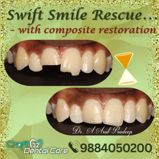 Composite Restoration at Craft32 dental care saligramam ๐ Swift Smile Rescue with Composite Restoration at Craft32 Dental Care! ๐ At Craft32 Dental Care in Saligramam, we specialize in transforming smiles quickly and effectively with composite restorations. If you have chipped, cracked, or decayed teeth, our expert team, led by Dr. Arul Pradeep, can restore your smile to its natural beauty in no time. Composite restorations are a versatile and minimally invasive solution that blends seamlessly with your existing teeth, providing both aesthetic and functional benefits. Why choose composite restoration at Craft32 Dental Care? ๐น Natural Appearance: Our high-quality composite materials match your tooth color perfectly, ensuring a natural and flawless finish. ๐น Quick and Efficient: Most procedures can be completed in a single visit, saving you time and hassle. ๐น Durable and Long-Lasting: Composite restorations are strong and durable, providing a lasting solution to dental imperfections. ๐น Minimally Invasive: Preserve more of your natural tooth structure with our conservative approach. Join our many satisfied patients who have experienced the swift and stunning results of composite restoration. Book your appointment today and let us rescue your smile!