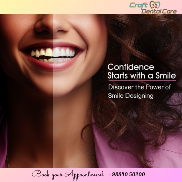 Confidence starts with a smile — it’s the first thing people notice and the lasting impression you leave behind. At Craft32 Dental Care, we believe that a beautiful smile is more than just aesthetics; it’s a reflection of inner confidence and self-assurance. Our expert smile designing treatments are tailored to enhance your unique facial features, creating harmony and balance. Using cutting-edge technology and artistic precision, we craft smiles that look natural and feel amazing. Whether it’s closing gaps, correcting alignment, or perfecting your teeth with veneers, we’re here to bring out the best in your smile. Dr. Arul Pradeep and our skilled team focus on personalized care, ensuring your comfort every step of the way. With years of experience and a passion for perfection, we help you rediscover your smile — and your confidence. Step into our clinic and experience a transformation that goes beyond just dental work. Because at Craft32, we don’t just design smiles, we design confidence.