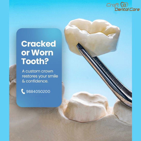 Cracked or worn teeth were successfully treated at Craft 32 Dental Care with precision and care. A custom-made dental crown was designed to perfectly restore the tooth’s strength, shape, and natural appearance. Advanced technology ensured an accurate fit and long-lasting results. The procedure was comfortable, minimally invasive, and focused on patient satisfaction. With this treatment, the patient’s smile, function, and confidence were beautifully restored.