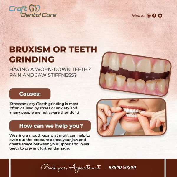 Bruxism or teeth grinding treatment is effectively managed at our clinic. Many patients experience worn-down teeth and jaw discomfort due to unconscious grinding, often caused by stress or anxiety. At Craft 32 Dental Care, we provide customized night guards to protect your teeth and relieve jaw strain. Our expert evaluation helps identify the root cause and prevent further enamel damage. Experience safe, comfortable, and personalized care with Dr. A. Arul Pradeep for lasting relief from teeth grinding.