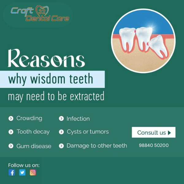 Wisdom tooth extraction is carefully performed at our clinic by our experienced dental team to relieve pain and prevent future dental issues. The procedure is done under local anesthesia, ensuring a painless and comfortable experience. We use advanced techniques and sterilized instruments for safe and precise removal. Post-extraction care and guidance are provided to promote quick healing. At Craft 32 Dental Care, we ensure every patient receives gentle, expert care for a smooth recovery.